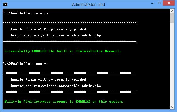 Enable Admin is the command-line tool to quickly enable or disable built-in Administrator account.