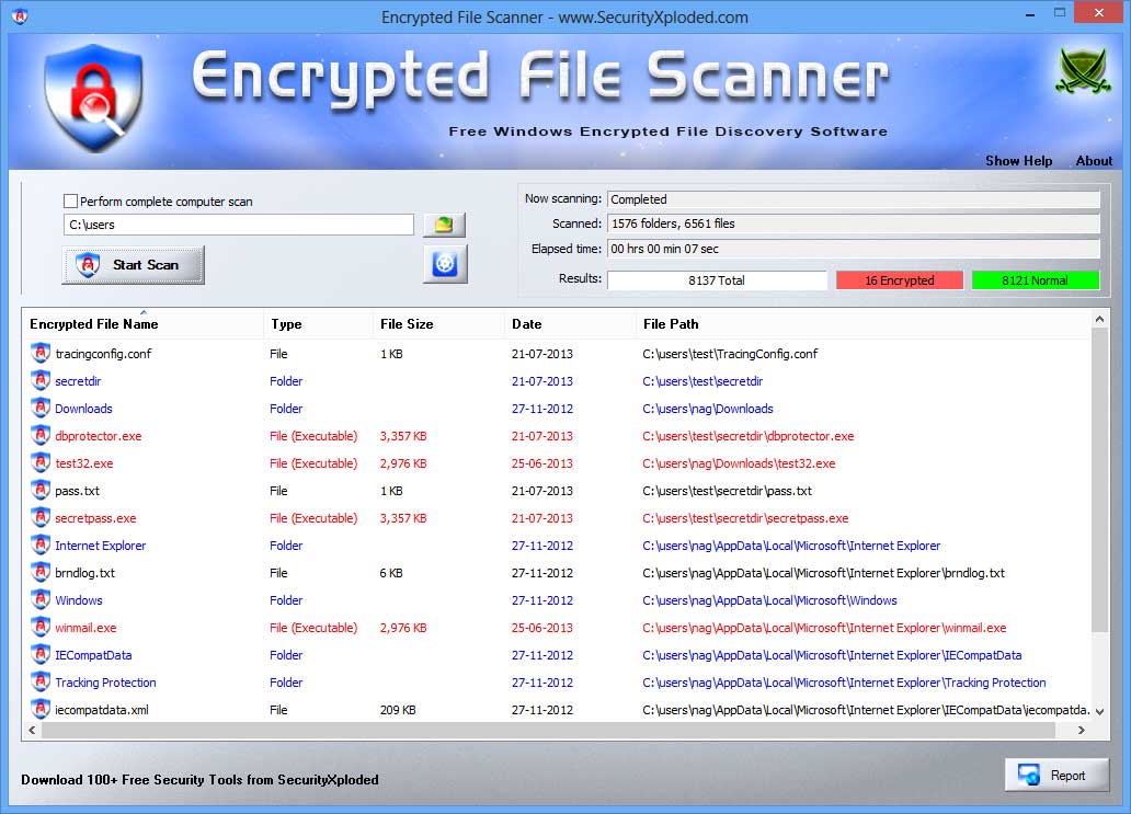 Encrypted File Scanner helps you to quickly find all such encrypted files using the parallel multi threaded scan of all the folders. It also automatically detects the Encrypted Executable Files (EXE, DLL, COM etc) and shows them in red color for easier identification. Similarly 'Encrypted Files' are shown in black color and Encrypted Folders' are shown in blue color.