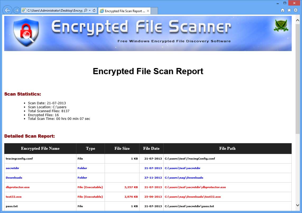 | Screenshot 2: Detailed HTML Report of Encrypted File scanning operation. |