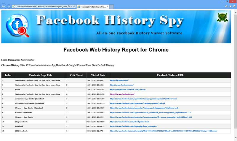 | Support for Facebook history display from PaleMoon browser. Quickly visit history website in browser on double click. Improved CSV report. Fixed date/time display problem with Chrome history. |
