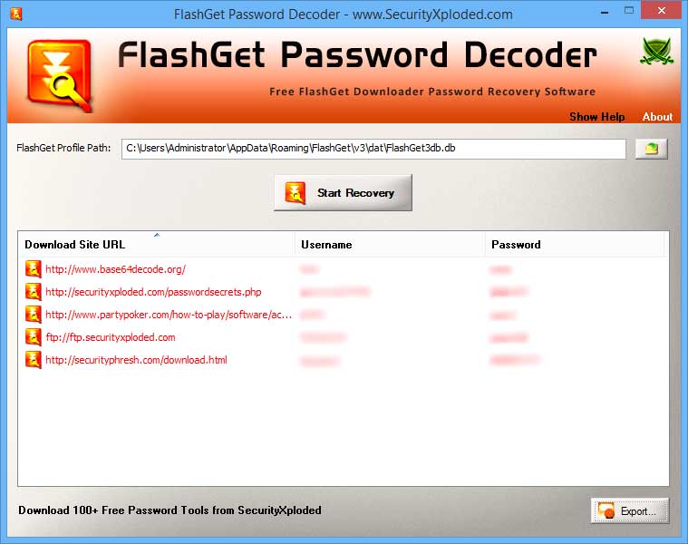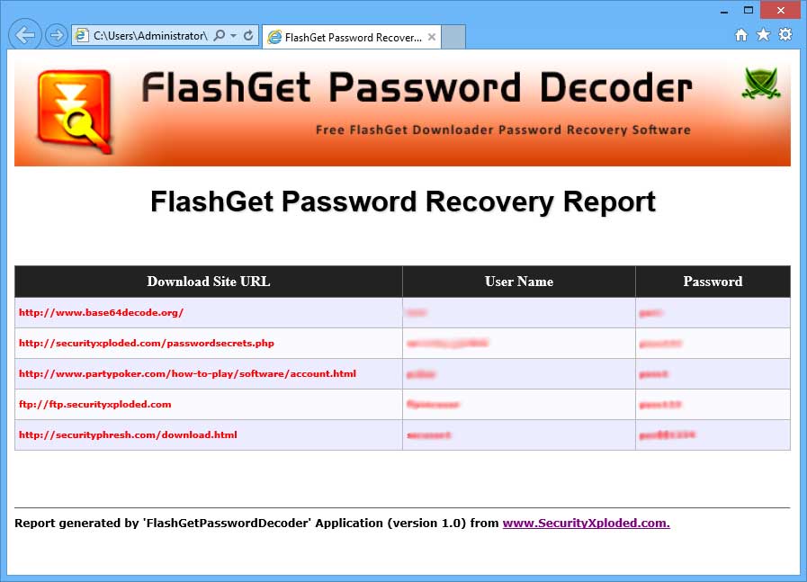 FlashGet Password Decoder is not a hacking tool as it can recover only your stored passwords. It cannot recover the passwords for other users unless you have right credentials. Like any tool its use either good or bad, depends upon the user who uses it. However Author or SecurityXploded is not responsible for any damage caused due to misuse of this tool.