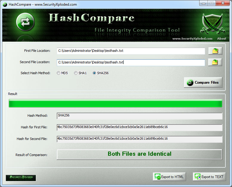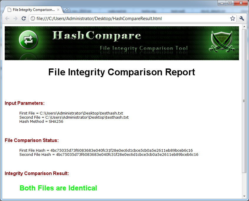 Hash based method is the standard way of verifying the integrity of files. Often it is used to check the Integrity of Download Files downloaded from the internet. It is also used to compare two versions of the same file. In such cases HashCompare comes handy in performing quick comparison of the files.