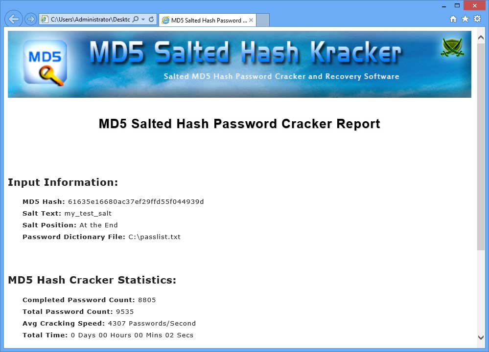 Screenshot 2: MD5 Hash Password Recovery report generated by MD5SaltedHashKracker
