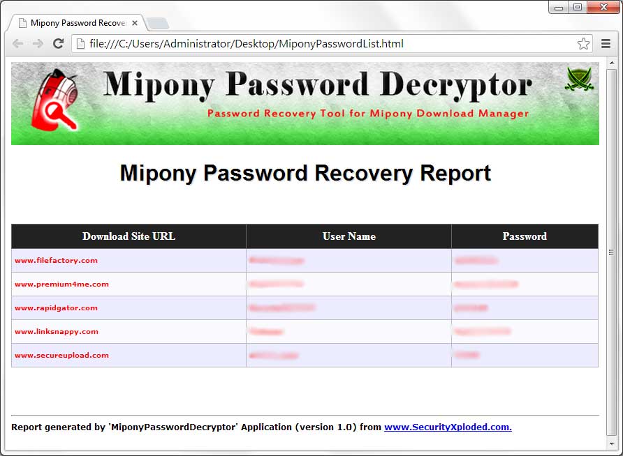 Screenshot 2:  HTML Report of Recovered Mipony Password List