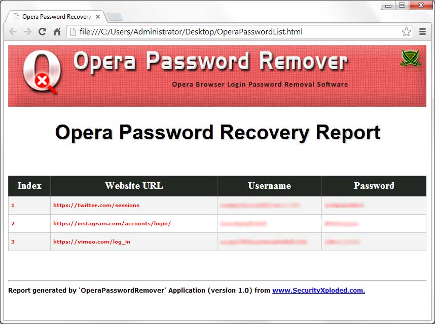| Screenshot 1: Opera Password Remover showing the recovered passwords