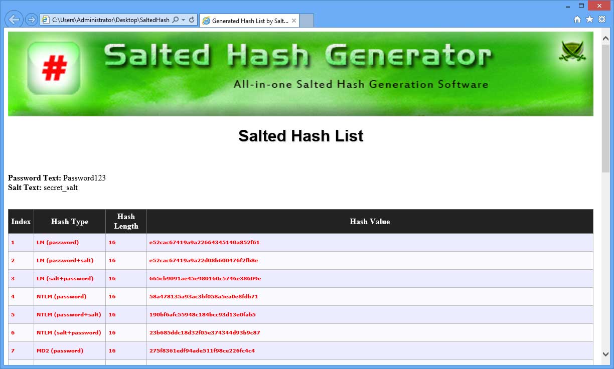 - You will see all the hash types being generated for various combination of password & salt as shown in the screenshot below.