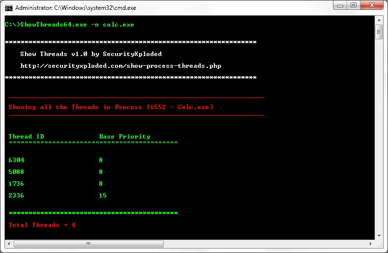 You can either specify the Process ID or Process Name to enumerate the threads. For each thread, it displays Thread ID and the Base Priority.