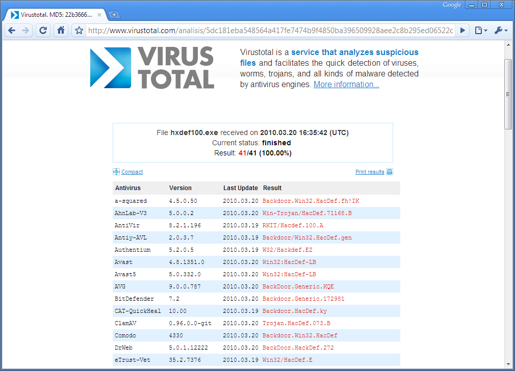 Screenshot 3: Online threat verification of uncovered 'HackerDefender' Rootkit stream file using VirusTotal.com.