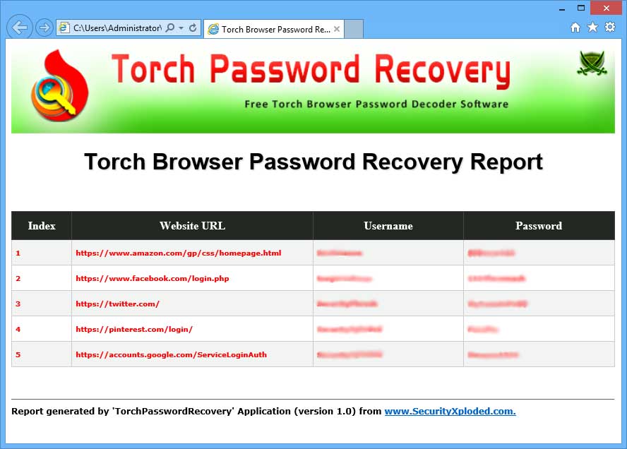 Torch Password Recovery Tool helps you to quickly & easily recover all these website login passwords stored by Torch browser. You can also save all the recovered password list to HTML/XML/TEXT/CSV file for future use.