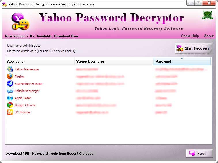 | Mega version featuring password hash recovery from Yahoo Messenger v7.x - v13.x. Includes feature to generate password recovery report in CSV (Comma-Seperated Values) file format. Also removed the support for command-line feature as now we have exclusive command-line tool - Yahoo Password Dump |